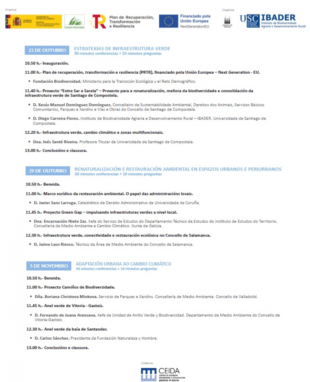 Este Ciclo de Conferencias está organizado polo Concello de Santiago de Compostela, o IBADER co fin de dar a coñecer as estratexias de Infraestrutura Verde a nivel estatal e autonómico, e reflexionar sobre o papel das entidades locais no marco das súas competencias en materia de infraestrutura verde.